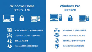 Windows HomeとProの違いを中小企業向けにわかりやすく解説。情報漏えい対策、リモートデスクトップ、PC管理、Microsoft 365連携など、業務でProを選ぶべき理由を具体的に紹介します。