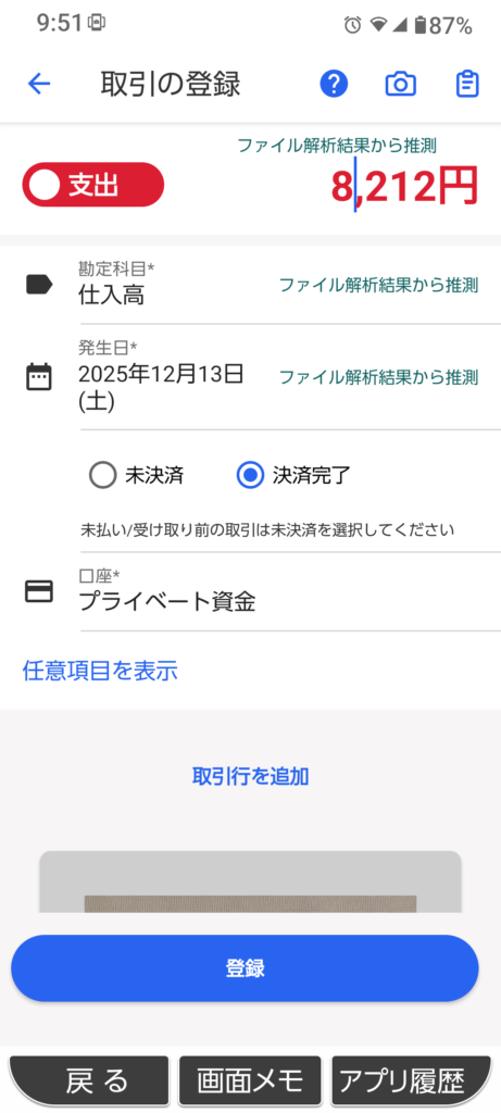 〇 勘定科目は自動仕訳されました。今回は交際費とか会議費とかにしたいですが、場面によっては正解ともとれる内容です