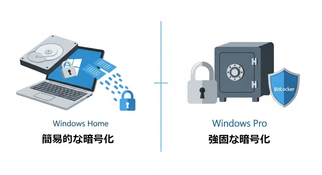 といった制約が多く、業務利用には不十分です。一方、Proの暗号化機能 「BitLocker」 は